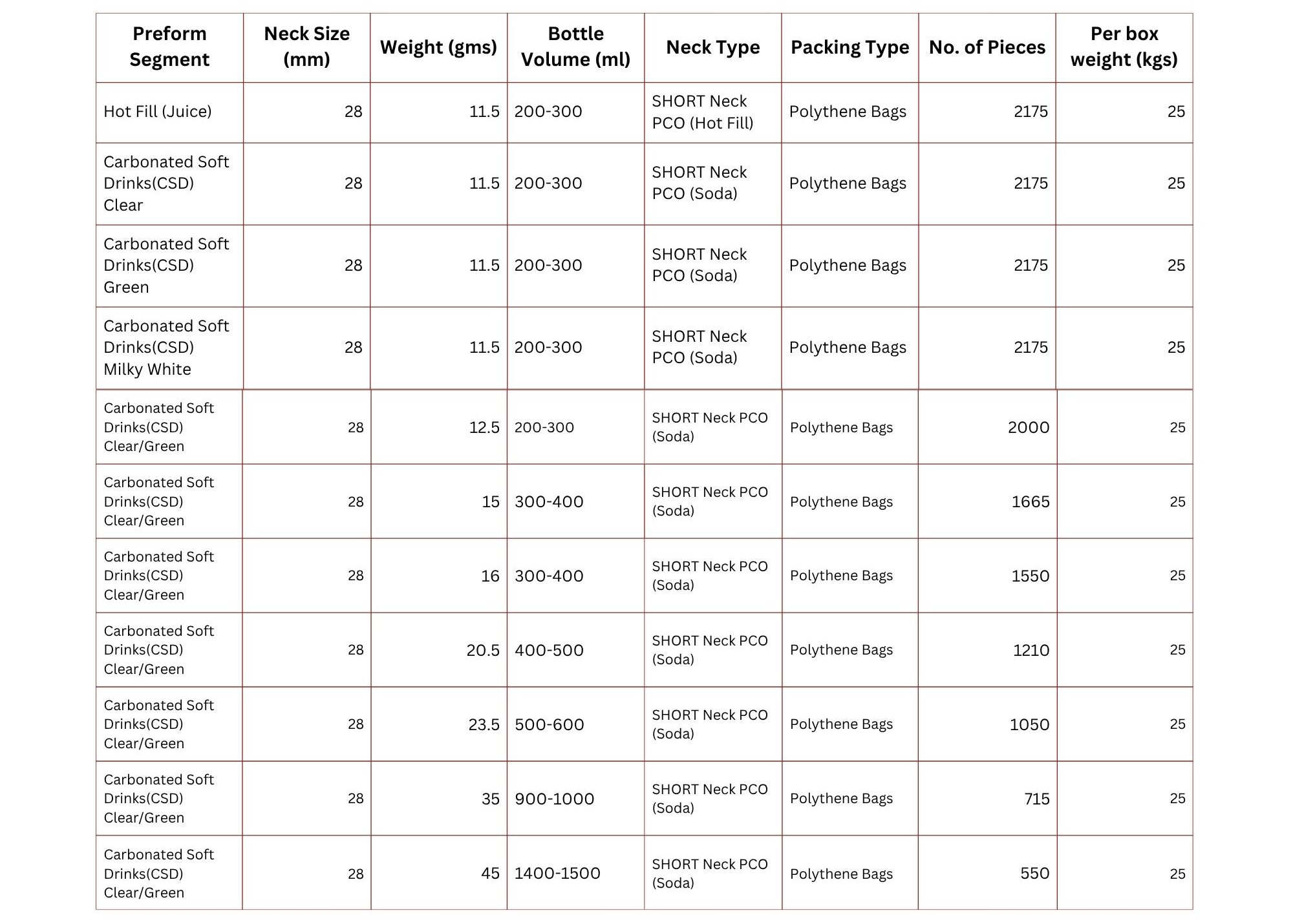 Manufactured using advanced injection molding technology, each preform maintains uniform wall thickness, smooth finish, and superior transparency. The short neck design reduces overall bottle weight without compromising stability, making them a preferred choice for brands focusing on cost efficiency, sustainability.